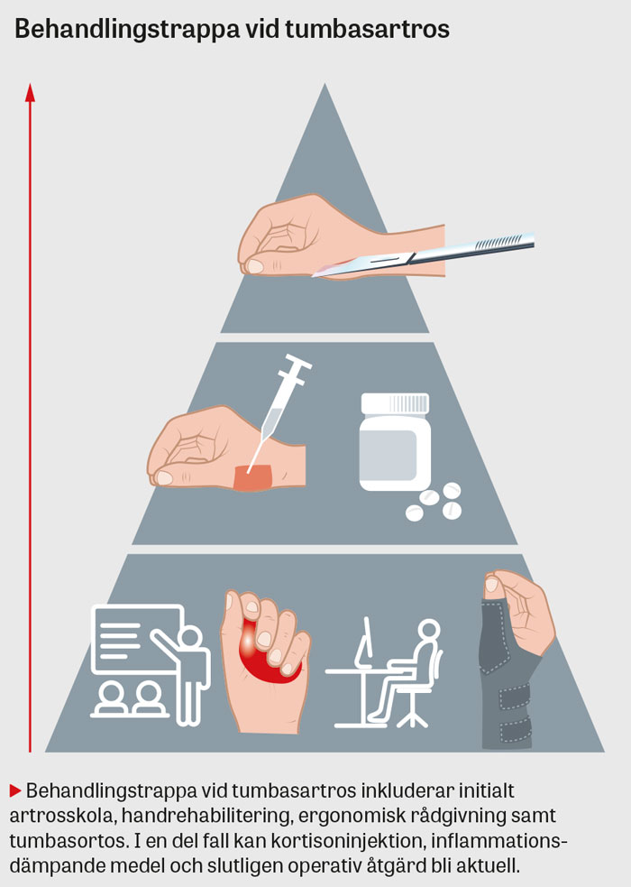 Generell artrosbehandling består av en behandlingstrappa, som inkluderar artrosskola, handrehabilitering med samtidig ortos, ergonomisk rådgivning, läkemedel och slutligen eventuell operativ behandling. Information avseende sjukdomsförlopp samt att tumbasartros är del av allmän leddegeneration är viktig att tillhandahålla. Vid rörelserelaterad smärta rekommenderas tumbasortos samt fysioterapi. Evidens för antiflogistika samt intraartikulär kortisoninjektion är bristande, och medikamentell behandling för tumbasartros är baserad på utlåtande från expertgrupper [26]. Remiss till handkirurg är befogad vid terapisvikt av icke-operativ behandling, samt vid uttalad smärtproblematik/vilovärk. Lämplig operationsteknik väljs utifrån funktionsnivå [25].
