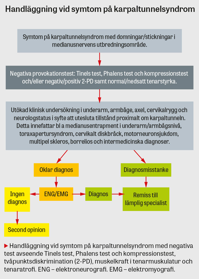 - Vid otydliga symtom alternativt avvikande status kan neurofysiologisk undersökning (elektroneurografi eller eventuellt elektromyografi) vara till hjälp, men ska användas omdömesgillt. Elektroneurografi mäter strukturella förändringar i medianusnerven, som sänker nervledningshastigheten. Patienten kan således ha ett subjektivt och kliniskt karpaltunnelsyndrom med normal neurografi [11].