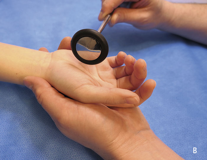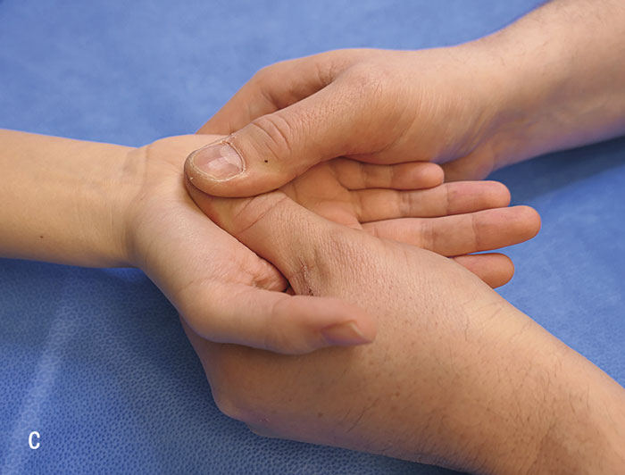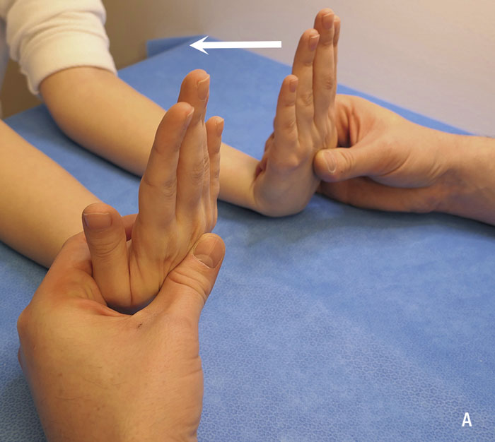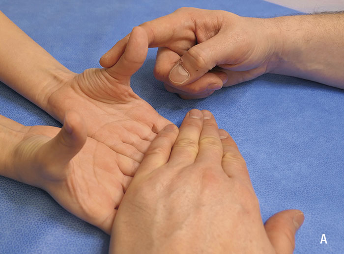 A. Undersökning av muskelstyrka i musculus abductor pollicis brevis. Placera patientens händer på ett underlag med handflatorna uppåt. Tryck ner tummen mot handflatan och undersök om det finns skillnad i muskelstyrka, jämfört med kontralateral tumme.