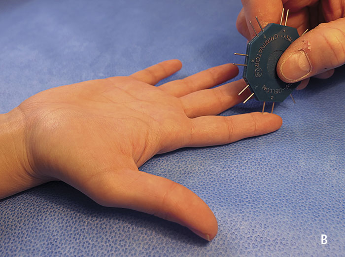 B. Sensibilitetstestning med tvåpunktsdiskrimination. I normalfallet föreligger ett diskriminationsavstånd under 5 mm, men jämför alltid med kontralateralt finger.