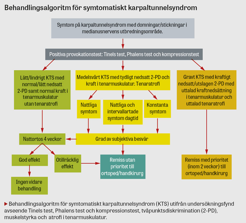 I lindriga till måttliga fall rekommenderas initialt volar nattskena (ortos) under 4 veckor i syfte att undvika handflexion och tryckstegring med påverkan på medianusnerven. Om karpaltunnelsyndrom misstänks vara orsakat av tenosynovit kan kortisoninjektion vara av värde hos patienter med medelsvårt–svårt karpaltunnelsyndrom [12]. Remiss till handkirurg/ortopedspecialist är indicerad vid svåra nattliga besvär, kontinuerlig känselnedsättning med eller utan samtidig muskelhypotrofi samt vid kvarstående symtom efter 4 veckors behandling med volar nattskena eller kortisoninjektion. Kirurgisk åtgärd innefattar dekompression genom klyvning av flexorretinaklet [10].