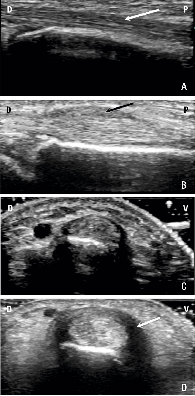 C. och D. Tvärgående bild av dessa senfack, ventralt (V) och dorsalt (D). Notera den uttalade tenosynoviten (vit pil) på patienten med morbus de Quervain.