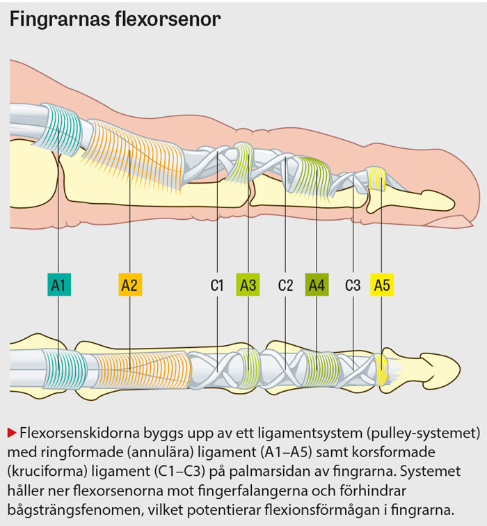 - Palpera över första annularligamentet (A1) samt flexorsenan volart distalt i handflata för aktuellt finger, samt observera eventuell ömhet eller smärta. Om noduli föreligger kan den palperas volart vid A1-ligamentet och rör sig vid passiv rörelse av fingret, ofta med knäppningar och samtidig smärta.