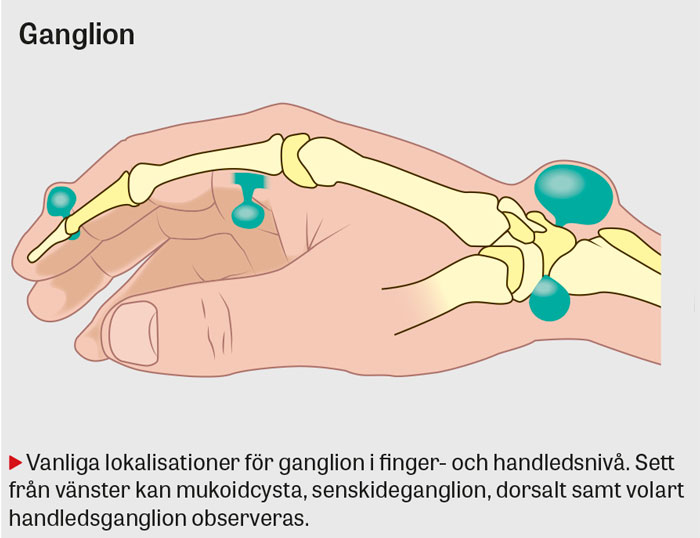 Ganglion är den vanligaste benigna resistensen i handen och är upp till 3 gånger vanligare bland kvinnor. Prevalensen har beräknats till 19 procent med incidens på 25 respektive 43 per 100 000 personer bland män och kvinnor [15]. De vanligast förekommande ganglion innefattar dorsalt och volart handledsganglion, senskideganglion samt mukoidcysta (dorsalt på DIP-led). Handleds- och senskideganglion uppträder oftast hos kvinnor i åldern 20–40 år, men kan även ses efter trauma och överbelastning av senor eller handled. Mukoidcysta är vanliga hos äldre individer, ofta med samtidig artros i DIP-led.