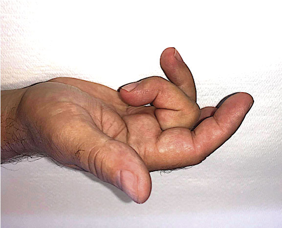 Patient med triggerfinger i långfingret. Notera ofrivillig flexion i distala falangen i samma finger. Vid avsiktlig maximalflektion i proximal interfalangeal (PIP)-led i ett finger med övriga fingrar raka, flekteras inte distala falangen.