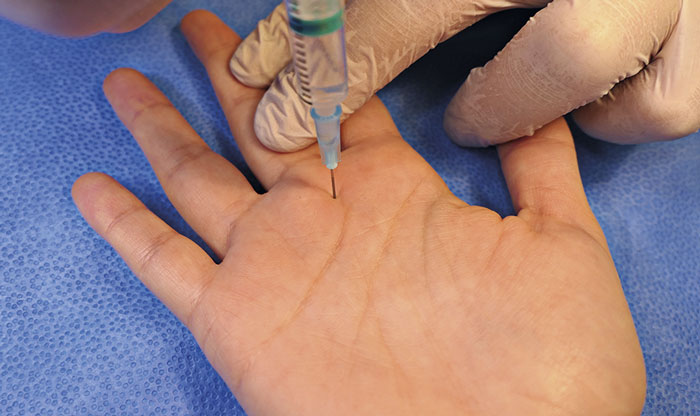 Injektionsteknik vid triggerfinger: Palpera den mest smärtande punkten över A1-ligamentet och markera i huden med en penna med indragen spets. Håll ena handens fingrar över grundfalang och mellanfalang. I samband med injektion kan man då känna att senskidan fylls upp. Stick rakt ner tills nålen sitter i senan (känns som ett tydligt motstånd). Lägg ett tryck på sprutan för att verifera det tydliga motståndet mot injektion (krävs ordentlig kraft för att injicera i själva senan). Med bibehållet tryck på sprutan backas nålen försiktigt tills motståndet släpper, och då ligger spetsen i spatiet mellan sena och senskida. Injicera. Det går också att deponera kortisonet utanför senskidan i A1-området.
