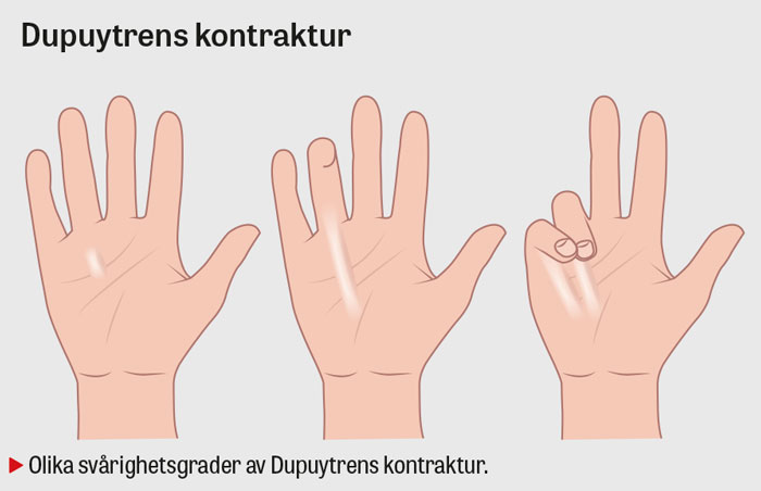 Dupuytrens kontraktur, ibland kallad vikingasjukan, drabbar ofta medelålders individer och är cirka 5–7 gånger vanligare bland män. Prevalensen har beräknats till cirka 1 procent, med incidens på 138 respektive 49 per 100 000 personer bland män och kvinnor [8]. Dupuytrens kontraktur är vanligare vid diabetes mellitus samt hos personer med nordeuropeiskt ursprung [9].