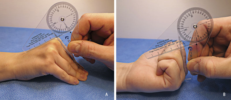 Extensionsinskränkning vid Dupuytrens kontraktur kan vara svår att uppskatta, och därför bör vinkeln i (A) metakarpofalangeal (MCP)- och (B) proximal interfalangeal (PIP)-led mätas. Vid extensionsdefekt i MCP-led och/eller PIP-led med subjektiva besvär bör remiss skickas till handkirurg för bedömning av eventuell åtgärd.