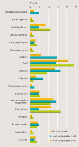Isolat efter tillfällig KAD och vid ren intermittent kateterisering räknades också in. Med antibiotikaprofylax avsågs antibiotika med låg, icke-terapeutisk, profylaktisk dos.