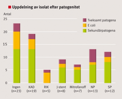Urinodlingar från barn utan antibiotikaprofylax hade en högre andel E coli och P aeruginosa, medan urinodlingar från barn med profylax hade en högre andel grampositiva sekundärpatogener och E cloacae. Andelen sekundärpatogena bakteriearter var högre hos barngrupperna med J-stent, avledning enligt Mitrofanoff, nefropyelostomi- och suprapubiskateter än hos med barn med KAD respektive barn utan urinavledning (Figur 2).
