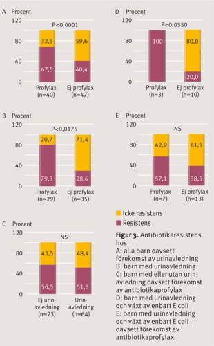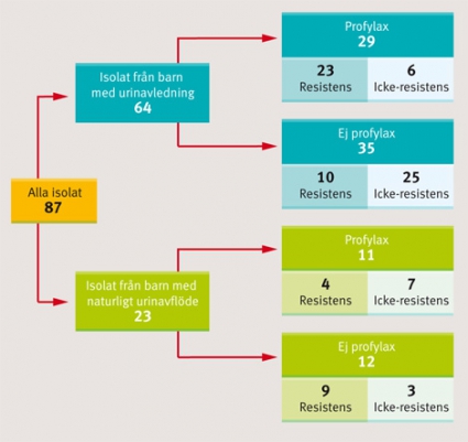 I en kontrollkalkyl (där varje individ räknades med en gång) förekom 14 isolat från patienter som behandlats med profylax och 35 som inte haft profylax. Resistens förekom hos 71 procent av de 14 profylaxbehandlade patienterna och hos 34 procent bland patienterna utan profylax. Vid förekomst av urinavledning och profylax växte resistenta bakterier i 80 procent av isolaten. Hos dem med urinavledning men ingen profylax växte resistenta bakterier endast i 22 procent av isolaten.