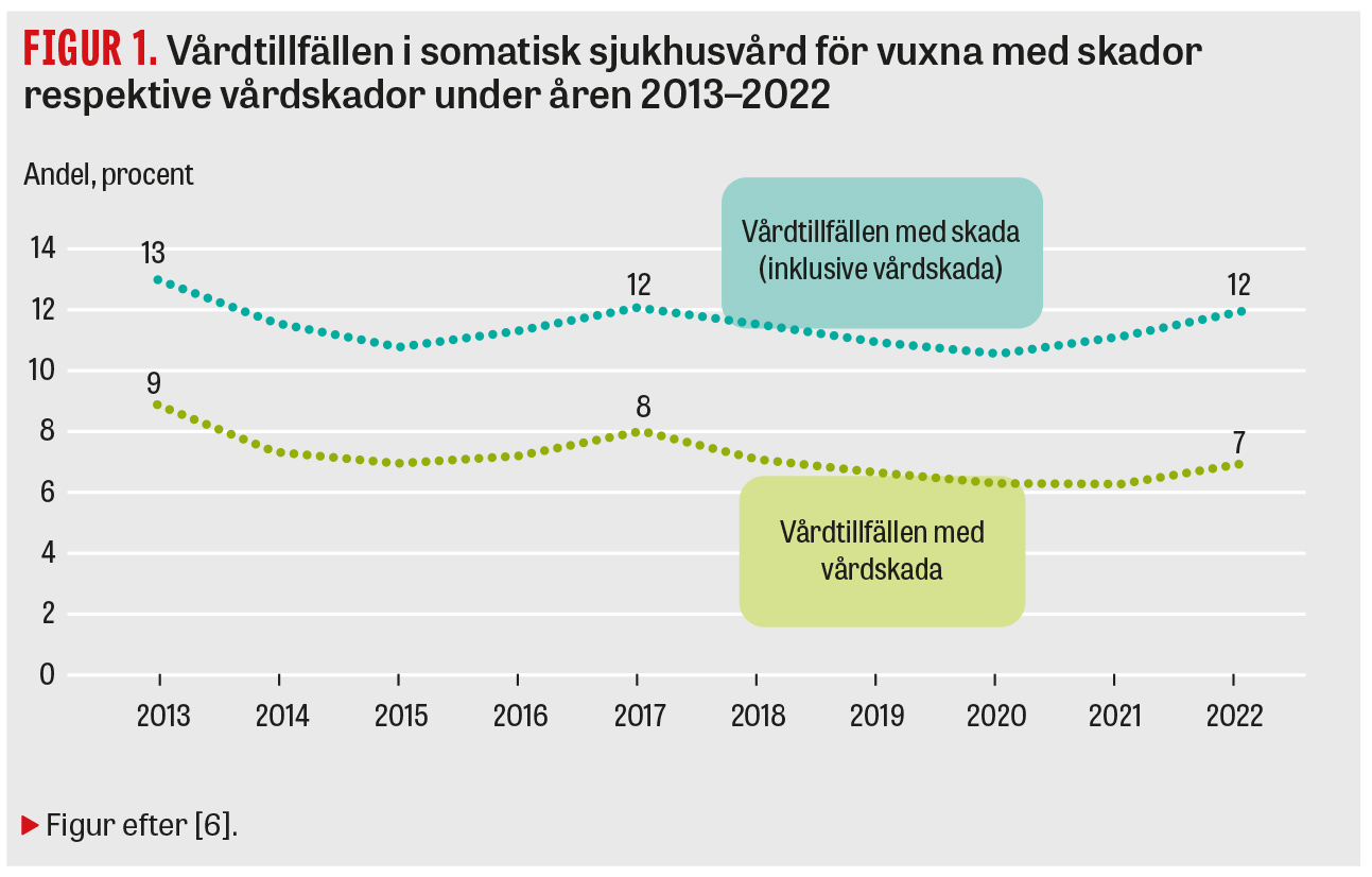 Riksrevisionen konstaterade i en rapport 2023 att statens insatser för att förhindra vårdskador och missförhållanden i vården av äldre är ineffektiva [1]. Inspektionen för vård och omsorg (Ivo) slår i en delredovisning av den nationella sjukhustillsynen fast att det finns en betydande brist på disponibla vårdplatser på samtliga akutsjukhus som granskats och att patientsäkerhetsbristerna vid sjukhusen är omfattande [2]. Klagomål finns också på långa väntetider, bland annat på akutmottagningar [3]. Signalerna är också många om stora problem när det gäller arbetsmiljön i vården [4, 5]. Långsamt minskande förekomst av vårdskador (Figur 1 och 2) talar dock för ökad patientsäkerhet [6, 7]. Fortlöpande kommer nya rapporter om utomordentliga och ytterligare förbättrade resultat [8-11].