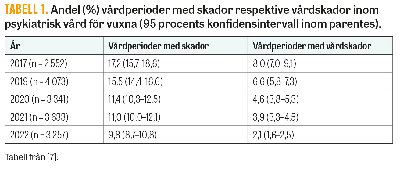 Bilden av svensk patientsäkerhet kan te sig motsägelsefull. Det är ett brokigt landskap av rapporter, vittnesbörd och data som träder fram. Signaler om köer, resursbrist, bemanningsproblem, kompetensbrist, vårdskador och larm om hotad patientsäkerhet fyller medierna. Arbetsmiljön beskrivs som otillfredsställande, och vårdens medarbetare upplever ofta etisk stress. Parallellt kommer rapporter om medicinska framgångar och förbättrade behandlingsresultat. Dessutom ses på nationell nivå vissa tecken till förbättring av patientsäkerheten genom minskad förekomst av vårdskador mätt med markörbaserad journalgranskning i somatisk (Figur 1) och psykiatrisk vuxenvård (Figur 2). Intrycket kan bli att det handlar om olika världar, fastän de goda medicinska resultaten kommer ur den vård som framstår som så problemfylld.