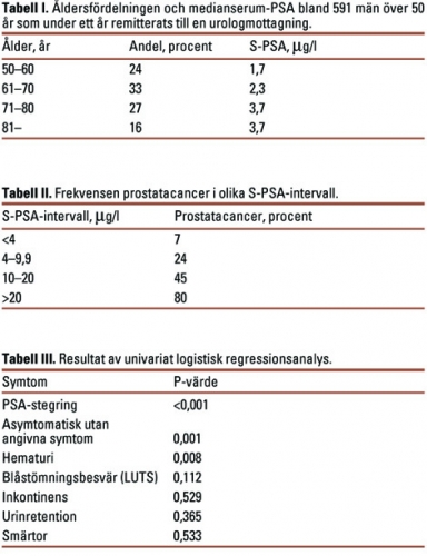 Bland männen som inremitterats för LUTS, inklusive urinretention, eller för hematuri påvisades prostatacancer hos 15 respektive 5 procent. Av dem som inremitterades för enbart S-PSA-stegring, utan något samtidigt symtom eller annat patologiskt fynd angivet i remissen, hade 54 procent prostatacancer. Bland männen i denna studie var det alltså en tre gånger större risk för prostatacancer vid en S-PSA-stegring utan samtidiga symtom angivna i remissen än vid samtidiga LUTS-besvär. Detta är i och för sig inte överraskande. Det visar att det finns flera tillstånd, speciellt godartad prostataförstoring, som ger både LUTS och S-PSA-stegring. Lokaliserad prostatacancer ger sällan symtom, däremot förhöjning av S-PSA.