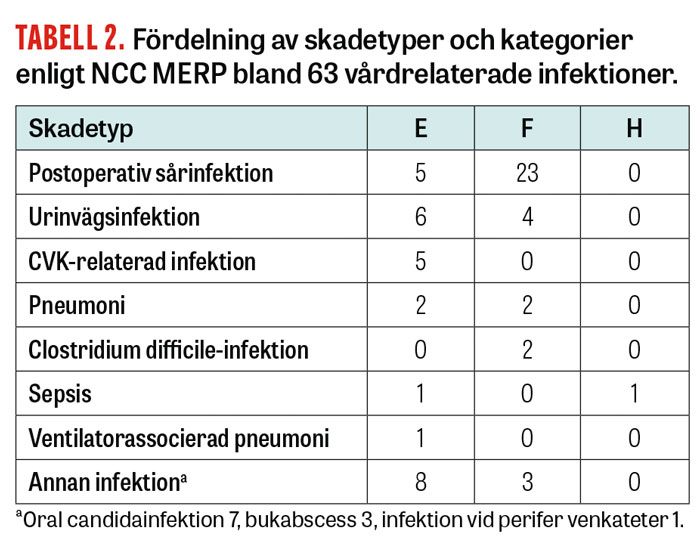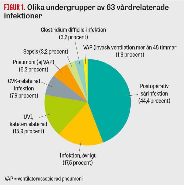 Av 63 vårdrelaterade infektioner bedömdes 3,2 procent som inte undvikbara, 9,5 procent som sannolikt inte undvikbara, 76,2 procent som sannolikt undvikbara och 11,1 procent som undvikbara.