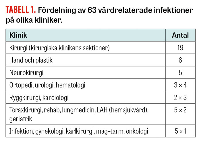 Vid 59 vårdtillfällen (12,3 procent) noterades 63 vårdrelaterade infektioner. För patienterna med VRI var medianåldern 66 år (23–95 år) och vårdtiden 3–62 dagar (medianvärde 8 dagar). Patientgruppen med VRI bestod av 33 män (55 procent) och 26 kvinnor (45 procent). Av de 480 patienterna var 221 opererade (46,0 procent). Vårdrelaterade infektioner förekom utan någon säsongsvariation på 15 olika kliniker och var vanligast där operativa ingrepp gjordes (Tabell 1). Hos de patienter som lagts inakut förekom VRI hos 53 procent av det totala antalet VRI-fall. Figur 1 visar de olika skadetyperna för samtliga VRI. Postoperativ sårinfektion var vanligast och utgjorde 44,4 procent (n = 28) av totala antalet VRI (n = 63). Andra typer av infektion (t ex abscess, oral Candida-infektion) utgjorde 17,5 procent, kateterrelaterad UVI 15,9 procent, CVK-relaterad infektion 7,9 procent och pneumoni 6,3 procent av samtliga VRI.