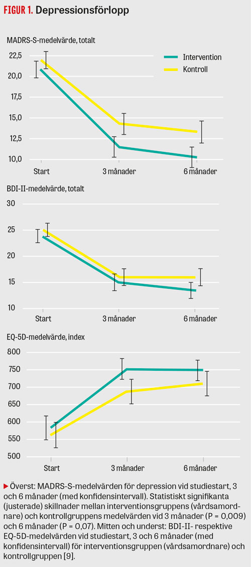 Depressionsförlopp för vårdsamordnarpatienterna respektive patienterna som fått »sedvanlig behandling« beskrivs i Figur 1. Både kontroll- och interventionspatienterna fick en ordentlig reduktion av depressionssymtomen, och för interventionsgruppen var både reduktionstakt och andel som låg under MADRS-S-gränsvärdet 12 signifikant större än för patienter vid kontrollvårdcentralerna vid 3 månader och 6 månader.