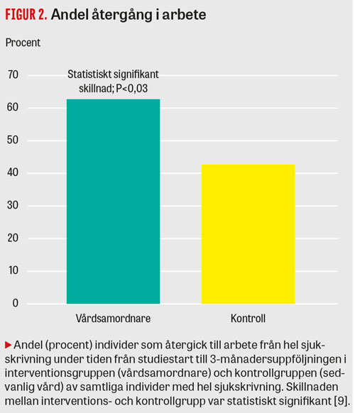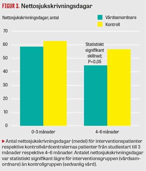 Bland dem som var sjukskrivna vid studiens start (50,5 procent i interventionsgruppen, 55 procent i kontrollgruppen) sågs signifikant högre återgång till arbete under de första 3 månaderna i gruppen som hade vårdsamordnare (62 procent respektive 43 procent; P = 0,028) (Figur 2). Likaså var nettosjukskrivningstiden under perioden 4–6 månader signifikant lägre i denna grupp än i kontrollgruppen (45,0 respektive 56,6 dagar; P = 0,045) (Figur 3).