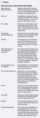 De områden där nya läkemedel och vacciner behövs enligt »Priority Medicines« sammanfattas i Fakta (se nästa sida). I takt med att industrin satsar på livskvalitetshöjande läkemedel i de rika delarna av världen tillgodoses behoven i fattigare länder sämre. Det är därför särskilt intressant att behovet av läkemedel mot infektionssjukdomar bedöms vara så stort. Det är också notabelt att flera av de läkemedel som finns på den svenska tio-i-topp-listan över storsäljande läkemedel skulle kunna inkluderas i det »polypill« vid hjärt–kärlsjukdom som rapportförfattarna föreslår. Detta förslag är inte okontroversiellt – efter publiceringen av den första artikeln om »polypill« i BMJ [2] följde en mycket livlig debatt.