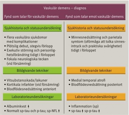 När man i praktiken diagnostiserar vaskulär kognitiv störning inklusive demens får man i stället använda sig av ett vägningsförfarande (vad som talar för och vad som talar emot, Figur 3). Basen för den kliniska diagnostiken av vaskulär kognitiv störning är läkarundersökningen, där man i typfallen finner hållpunkter för generaliserad kärlsjukdom med en någorlunda homogen symtombild bestående av exekutiva svårigheter, personlighetsförändring och gångrubbning (subkortikal småkärlsdemens, vaskulär lindrig kognitiv störning) alternativt varierande kvarstående tecken på kognitiv oförmåga efter stroke (storkärlsdemens, vaskulär lindrig kognitiv störning). Hjärnavbildning, särskilt med DT eller MR, bidrar till diagnostiken, men det är inte möjligt att ställa diagnosen vaskulär kognitiv störning enbart med hjälp av bildanalys. Laboratorieundersökningar kan också bidra till diagnostiken. Neuropsykologiska test kan vara till hjälp för att objektivt påvisa exekutiva, uppmärksamhetsrelaterade eller andra svårigheter tidigt i sjukdomsförloppet. Använder man sig av vägningsförfarandet enligt Figur 3 kan man på ett relativt enkelt sätt identifiera patienter som uppvisar kognitiv nedsättning till följd av olika former och grader av vaskulär sjuklighet.