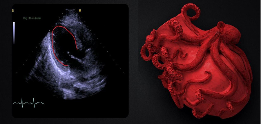 Figur 1. Ekokardiografi: Vänster kammare med normal inre dimension basalt, visuellt lätt rundad i apikala hälften. Formen av vänsterkammaren påminde om en japansk bläckfiskfälla, takotsubo. Illustration: Edoardo Umanzor. Fysiologiska kliniken i Norrköping har bidragit med ekokardiografibilden.