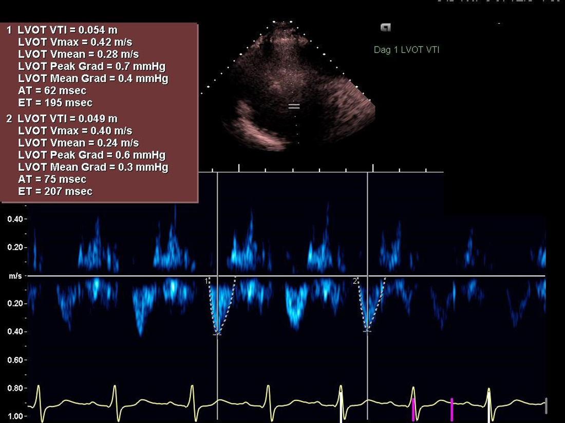 Figur 2. Ekokardiografi visade en uttalat nedsatt systolisk vänsterkammarfunktion; EF biplan cirka 15–20 procent. Utbredd väggrörelsestörning med akinesi i samtliga mid- och apikala segment, hypokinesi längst basalt. Måttlig mitralisinsufficiens. LVOT-VTI (slaglängden av vänsterkammarens utflödestrakt): 6 cm, som vid mycket låga slagvolymer. Uttalat nedsatt högerkammarfunktion. TAPSE (tricuspid annular plane systolic excursion) uttalat sänkt, 5 mm. Fysiologiska kliniken i Norrköping har bidragit med ekokardiografibilden.