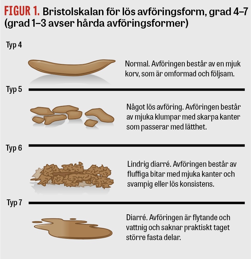 Vid behandling av patienter med svår diarré är det viktigt att stegvis öka behandlingsinsatserna. Graden av diarré uppskattas utifrån avföringens form med hjälp av Bristolskalan och avföringsfrekvensen. En avföringsdagbok under 1‒2 veckor kan hjälpa till att ge en tydlig bild av problemet. Enligt Bristolskalan [4] är i första hand avföringsformerna 6 och 7 (dvs lös eller vattnig avföring) associerade med diarré, men avföringsform 5 (»något lös avföring«) innefattas ibland i också diarrébegreppet (Figur 1).