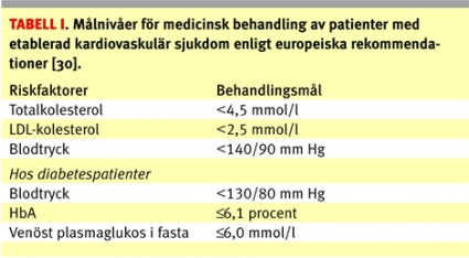 Gällande europeiska rekommendationer [30] (Tabell I) föreslår målnivåer för lipidsänkande behandling hos individer med etablerad arteriell sjukdom, inkluderande PAOD, totalkolesterol 4,5 mmol/l och LDL-kolesterol 2,5 mmol/l.