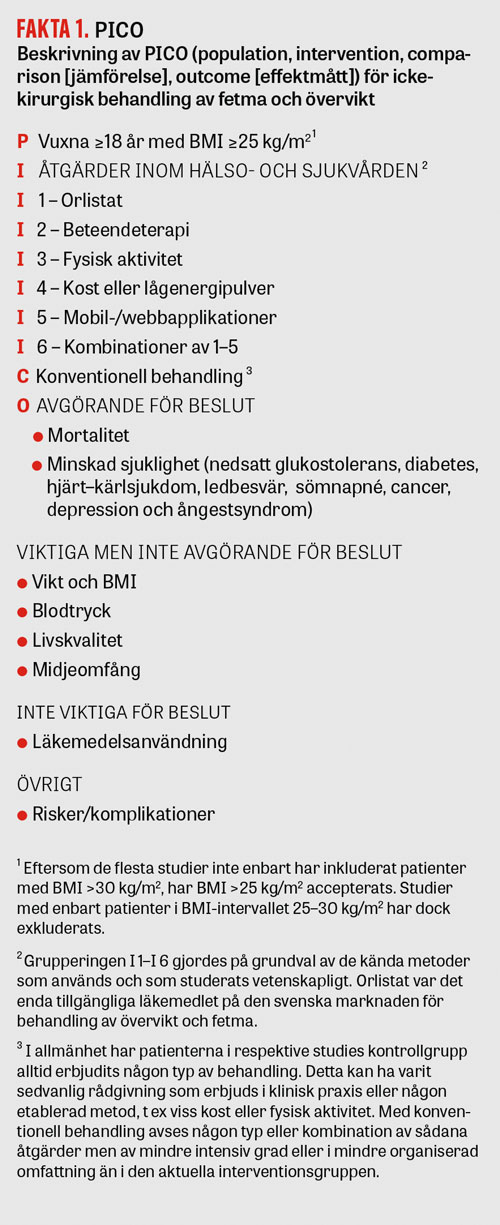 Den systematiska litteratursökningen, granskningsprocessen och evidensgraderingen av slutsatserna är den specifika metod med vilken en HTA-rapport genomförs. I den systematiska litteratursökningen används PICO (P = population, I = intervention, C = comparison [jämförelse] och O = outcome [effektmått]) (Fakta 1). För denna rapport har dess ingående studier värderat en viktminskning på 5–15 procent under 6–12 månader som relevant, vilket överensstämmer med internationella behandlingsriktlinjer [10-12].