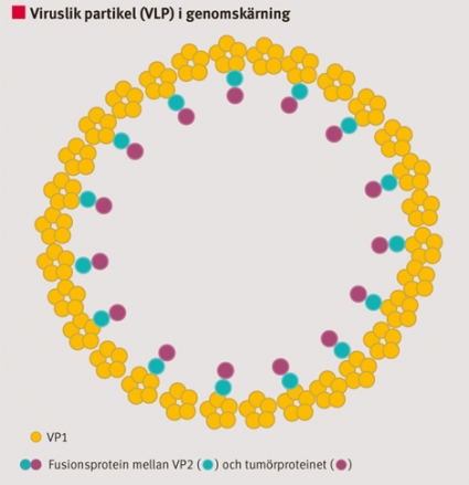 VLP kan erhållas genom att producera ett enda av virusets proteiner i insektsceller. Dessa VLP innehåller inget annat än virusproteinet och är därigenom helt ofarliga. Genom att koppla ett tumörprotein till ett annat av virusets proteiner (VP2) kan vi bilda VLP som även innehåller tumörproteinet (Figur 2) [13]. När VLP som innehåller tumörprotein ges till mus eller människa kan de effektivt gå in i exempelvis dendritiska celler, som är antigenpresenterande celler [14]; tumörproteinet bryts där ned för att upptäckas av immunförsvaret. Därigenom får man ett starkt immunförsvar mot tumörproteinet.