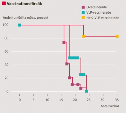 Vi har tagit fram VLP som innehåller tumörproteinet Her2 och visat att dessa VLP mycket effektivt kan föra in Her2 i celler. Vi har använt dessa VLP för att vaccinera en musstam där alla honor får bröstcancer före 5 månaders ålder. Efter endast en vaccination får majoriteten av dessa möss ett fullständigt skydd mot bröstcancer (Figur 3), och VLP-vaccinet är bättre än något annat vaccin som testats på dessa möss [13].