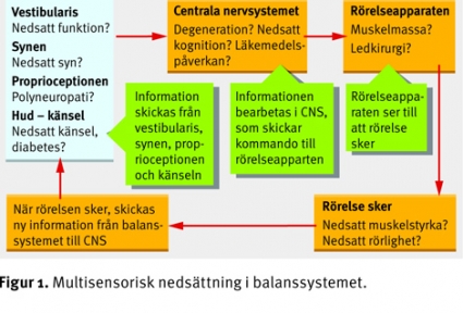 Normalt åldrande i sig är ingen sjuklig process men kan i vissa fall innebära att nedsättningen i funktion hos de sensoriska organen och hos hjärnstammen sammantaget blir symtomgivande (Figur 1). Yrseln är då sällan av rotatorisk art, utan patienter med multisensorisk svikt beskriver sina symtom som att de känner sig ostadiga, det gungar och de tar snedsteg ibland. Karakteristiskt är att symtomen förvärras när patienten rör sig utomhus eller i miljöer med mycket ljud- och synintryck, såsom stora varuhus med mycket folk.