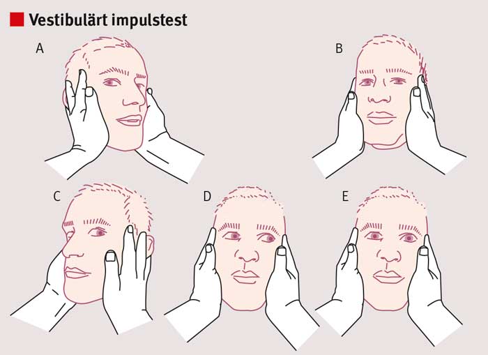 Vestibulärt impulstest (head impulse test) [62] bedömer den vestibulo-okulära reflexen. Patienten ombeds hålla blicken fixerad på en punkt, t ex läkarens näsa (A och C). Huvudet roteras snabbt åt ena hållet, och patientens förmåga att hålla blicken fixerad noteras. Rotation av huvudet åt patientens högra sida testar högersidiga vestibulära systemet, som består av innerörat, vestibularisnerven och vestibulariskärnan i hjärnstammen. Om patienten kan hålla fast blicken (B) talar det för ett fungerande vestibulärt system (dvs negativt test). Om patienten inte kan hålla fast blicken (D) och en återställningssackad förekommer (E), talar det för perifer vestibulär patologi, t ex vestibularisneurit (dvs positivt test). Täcktest (cover test) (se nedan) används för att identifiera fall där positivt fynd vid vestibulärt impulstest visar på hjärnstamspatologi.