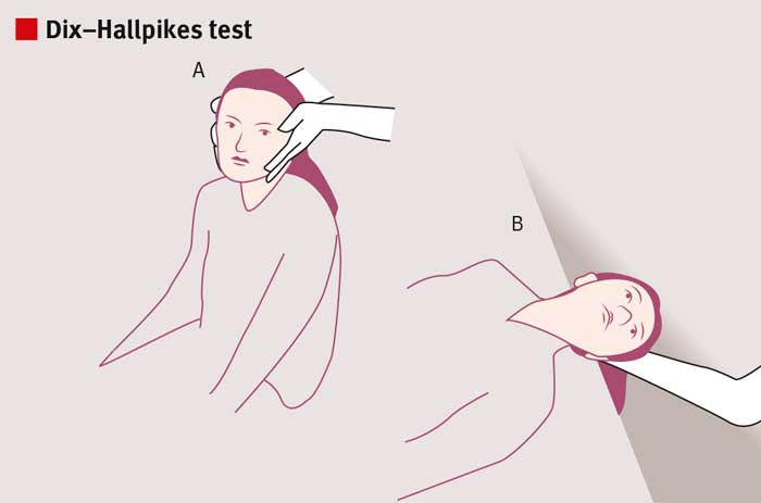 Dix–Hallpikes test [63] genomförs vid misstänkt godartad lägesyrsel. Med patienten sittande vrids huvudet 45° mot det öra som ska undersökas (t ex åt vänster i A). Då hamnar den posteriora båggången i bålens sagittalplan. Därefter läggs patienten snabbt ner med huvudet bakåtböjt (B). Hos överviktiga patienter kan manövern genomföras genom att snabbt fälla ner huvudändan av britsen. Ett positivt test utlöser uppåtgående och torsionell nystagmus, som slår mot patientens panna eller örat på den testade sidan (geotrop). Nystagmus brukar uppstå efter 2–5 sekunders latens och vara i <30 sekunder. Horisontell nystagmus talar för otoliter i den laterala båggången. Vissa patienter upplever övergående yrsel utan objektiv nystagmus. Eventuellt blir undersökningen mer sensitiv om patienten har Frenzels glasögon på [41]. Kristaller kan ibland vara bilaterala eller engagera flera båggångar, vilket försvårar tolkningen [64]. Om Dix–Hallpikes test är positivt kan Epleys manöver (se nästa bild) göras direkt.