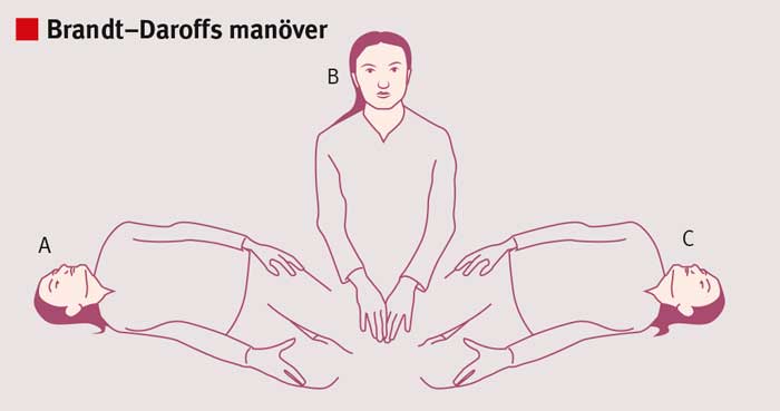 Brandt–Daroffs manöver [69] används när det är oklart vilken sida och vilka båggångar som är påverkade samt vid ospecifik yrsel. Patienten läggs ner på den ena sidan med huvudet vridet 45° mot taket (A) och ligger kvar till dess att yrseln har klingat av eller i minst 30 sekunder. Patienten sätter sig upp (B) och sitter kvar i 30 sekunder. Patienten läggs ner på den andra sidan med huvudet vridet 45° mot taket (C) och ligger kvar till dess att yrseln har klingat av eller i minst 30 sekunder. Patienten sätter sig upp igen (B). Patienten ska sedan i hemmet upprepa denna rörelse flera gånger dagligen till dess att yrseln inte längre kan utlösas.