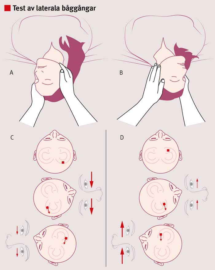 Om godartad lägesyrsel misstänkts men Dix–Hallpikes test är negativt, kan otoliter befinna sig i en lateral båggång. Test av laterala båggångar (head roll test) [67, 68] utreder förekomsten av kristaller i de laterala båggångarna. Manövern genomförs med patienten liggande på rygg och huvudändan av britsen upprest i 30° för att ställa de laterala båggångarna i vertikalplanet [41]. Huvudet vrids ca 90° åt ena sidan, och läkaren noterar riktningen och amplituden av eventuell nystagmus (A). Efter 30 sekunder vrids huvudet tillbaka till mittlinjen, och manövern upprepas med huvudvridning åt andra hållet (B). Testet är positivt om det utlöser yrsel och horisontell nystagmus. Nystagmus som slår mot undre örat eller marken beskrivs som geotrop (illustration A), medan nystagmus som slår mot övre örat eller taket beskrivs som apogeotrop (illustration B). Vid geotrop nystagmus är yrsel och nystagmus kraftigast vid vridning mot det sjuka örat. Vid apogeotrop nystagmus är yrsel och nystagmus kraftigast vid vridning mot det friska örat. När läkaren har identifierat vilket öra som är patologiskt och om nystagmusen är geotrop eller apogeotrop, kan Gufonis manöver (se nästa bild) genomföras.