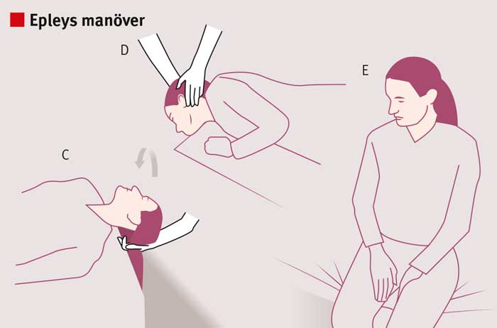 Epleys manöver genomförs vid godartad lägesyrsel orsakad av otoliter i den posteriora båggången. Målet med manövern är att flytta de lösa kristallerna runt den posteriora båggången och in i vestibulen, där de kan reabsorberas. Manövern inleds med Dix–Hallpikes test (se föregående bild). Patienten bör ligga i varje ställning i ca 60 sekunder eller till dess att symtomen har klingat av helt [41]. Manövern är framgångsrik i 80 procent av fallen redan efter ett försök [65]. Majoriteten av patienter som upplever övergående yrsel under Dix–Hallpikes test men som saknar nystagmus behandlas framgångsrikt med Epleys manöver [66].