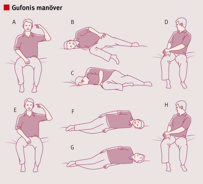 Gufonis manöver genomförs för att behandla godartad lägesyrsel i lateral båggång. A–D visar behandlingen för lösa otoliter i vänster öra (A), som utlöser geotrop (mot marken) nystagmus. Patienten läggs först ner på den minst yra (friska) sidan (B) och behåller denna ställning i 1–2 minuter till dess att yrsel och nystagmus försvunnit. Huvudet vrids därefter snabbt 90° mot golvet, och denna ställning behålls i 2 minuter (C). Patienten sätter sig därefter upp (D). Om patientens nystagmus är apogeotrop (mot taket) läggs patienten först ner på den minst yra (sjuka) sidan (F). Efter 1–2 minuter vrider patienten snabbt huvudet 90° mot taket (G), behåller ställningen i 2 minuter och reser sig sedan upp till sittande (H) [64].