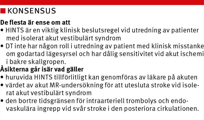 Undersökning med magnetisk resonanstomografi (MR) inom 48 timmar från symtomdebut vid akut vestibulärt syndrom ger falskt negativa fynd för stroke hos 12 procent av patienterna [33, 35], och sensitiviteten av tidig MR-undersökning vid isolerat akut vestibulärt syndrom kan vara så låg som 36 procent [40]. Eftersom HINTS har högre sensitivitet för stroke, är akut MR-undersökning svår att motivera även i de fall när den är tillgänglig.