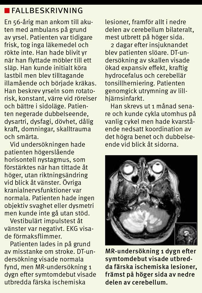 En retrospektiv studie av patienter med lillhjärnsinfarkt och isolerad yrsel visade att 80 procent hade riktningsväxlande nystagmus och/eller inte kunde gå utan levande stöd [32].