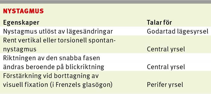 Debut. Plötslig debut inom sekunder till minuter tyder på stroke [4]. Gradvis symtomutveckling över minuter till timmar tyder på vestibularisneurit, även om stroke kan ha ett liknande förlopp.